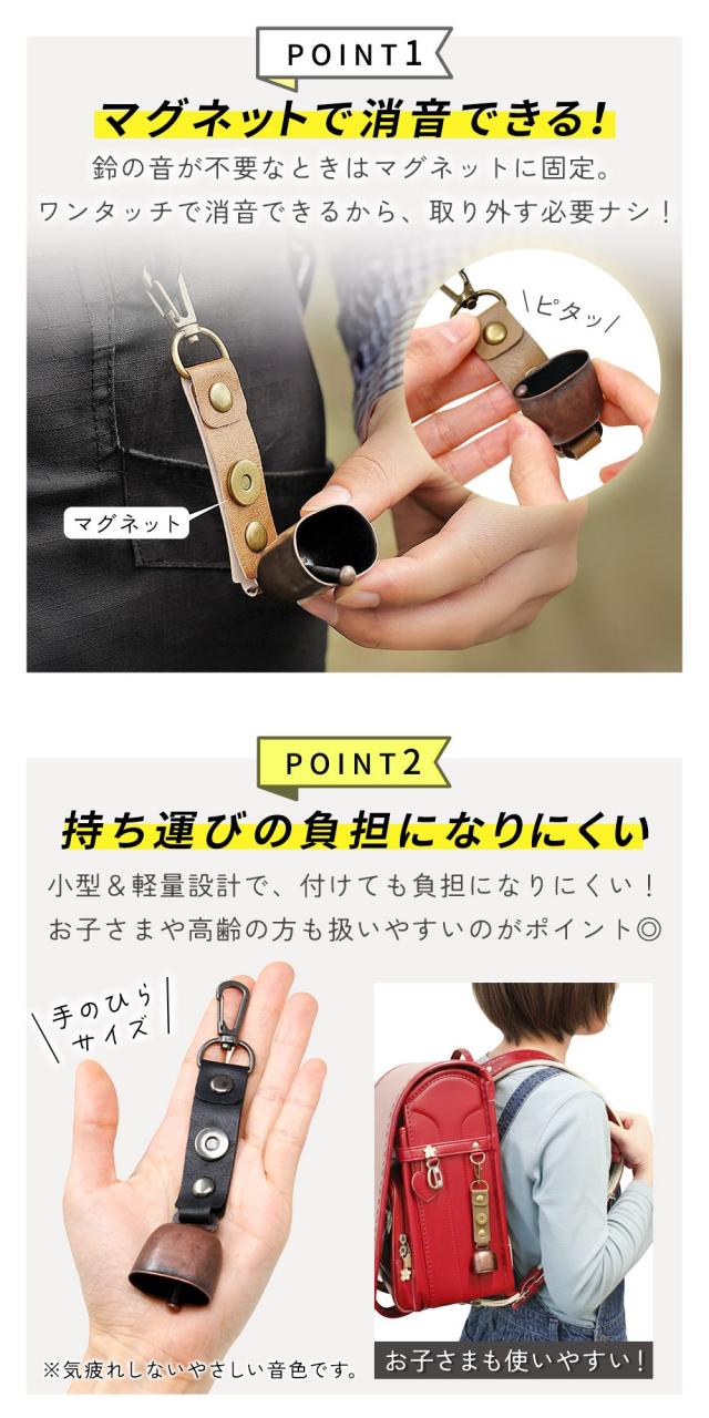 マグネットで鈴の揺れを抑え、音量を軽減できる消音機能付き。人通りの多い場所では音を抑え、公園や林、畑道など草木の多い場所や人けの少ない所ではしっかり鳴らすなど、状況に応じた使い分けが可能です。熊対策や防犯として外出時の備えに役立ちます。