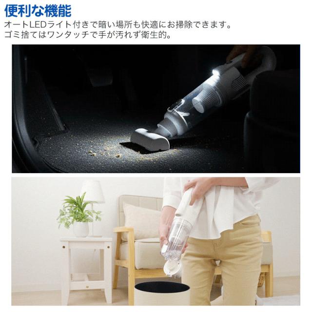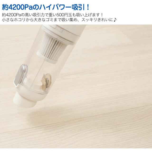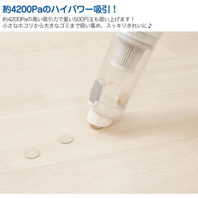 | 商品説明 | 約4200Paのハイパワー吸引を実現した、軽量スマートクリーナー。重い500円玉も吸い上げる高い吸引力で、小さなホコリから大きなゴミまでしっかりキャッチします。USB充電式のコードレスタイプのため、コンセントのない場所でも使用でき、家中さまざまな場所のお掃除に便利です。本体は約520gと軽量で、片手でもラクに操作可能。4種のヘッドと延長パイプを使い分けることで、床掃除はもちろん、家具の下や車内、エアコン周りなど幅広いシーンに対応します。オートLEDライトやワンタッチ式ゴミ捨て機能を備え、ダストカップとフィルターは水洗い可能。日常のお掃除を快適にサポートする1台です。 |