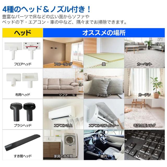 複数のアタッチメント付きで床・車内・家具周りなど幅広く対応します。