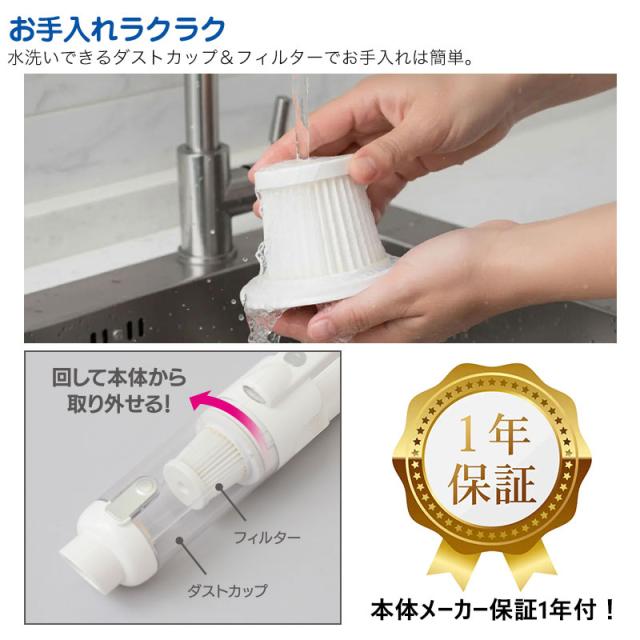 | ご使用方法 | 【充電方法】 ・初めて使用する際は、充電してから使用してください。最大で約4時間で満充電になります。 ・付属のUSBケーブル(Type-C側)を本体に接続し、USBアダプター(Type-A側)をコンセントに差し込んでください。 ・充電ランプが赤色点灯中は充電中、緑色に変わると充電完了です。 ※定格電源(5.0V/2.0A)のUSB電源を使用してください。 ※USB PD(パワーデリバリー)対応充電器は使用できません。 【組み立て方法】 ・スティッククリーナーとして使用する場合は、本体にダストカップ、延長パイプ(1〜2本)を取り付け、先端に各アタッチメントを差し込んでください。 ・ハンディクリーナーとして使用する場合は、本体にダストカップを取り付け、用途に応じたアタッチメントを差し込んでください。 ・蛇腹ホースを使用する場合は、ジョイント1・ジョイント2を取り付け、各アタッチメントと接続してください。 【お手入れ方法】 ・必ず本体からアタッチメントを外してからゴミ捨てを行ってください。 ・ダストカップ開閉ボタンを押すと、ダストカップが開きゴミを捨てることができます。 ・ダストカップおよびフィルターは水洗い可能です。 ・洗浄後は十分に乾燥させてから元に戻してください。 |