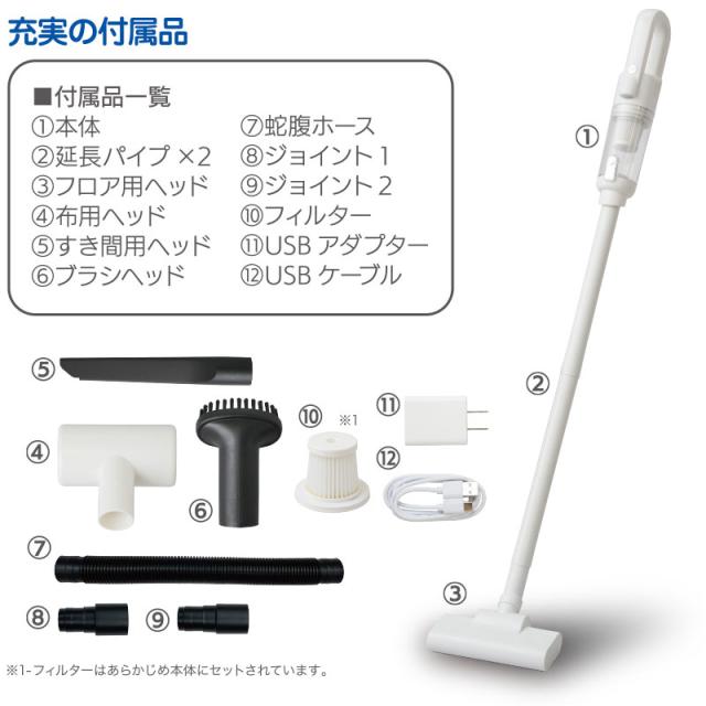 | セット内容 | 本体×1、延長パイプ×2、フロアヘッド×1、布用ヘッド×1、すき間用ヘッド×1、ブラシヘッド×1、蛇腹ホース×1、ジョイント1×1、ジョイント2×1、フィルター×1、USBアダプター×1、USBケーブル×1、取扱説明書/保証書×1 |