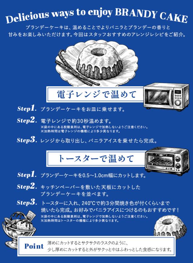 マダガスカル産バニラと、フランス産葡萄でつくられたブランデーを練り込み焼き上げた、甘く恍惚な香りのブランデーケーキ。