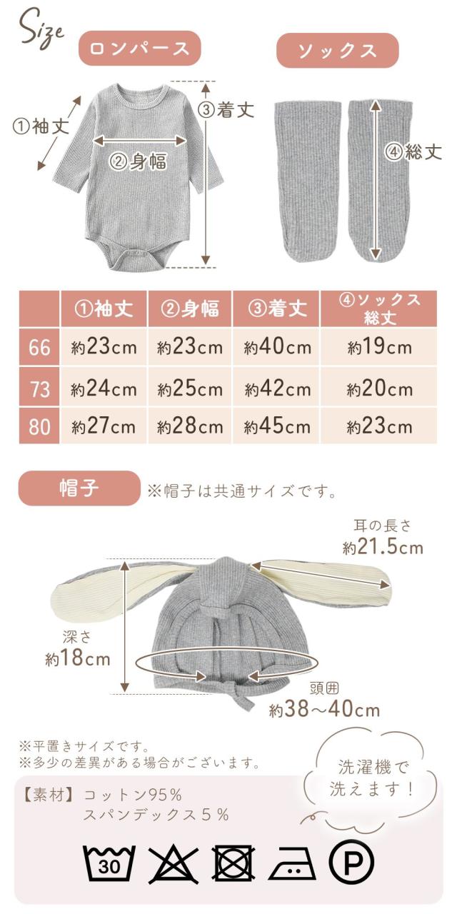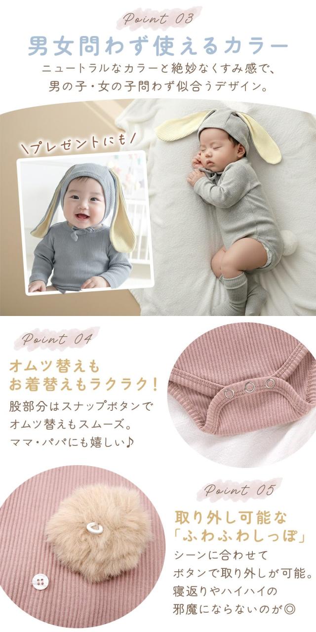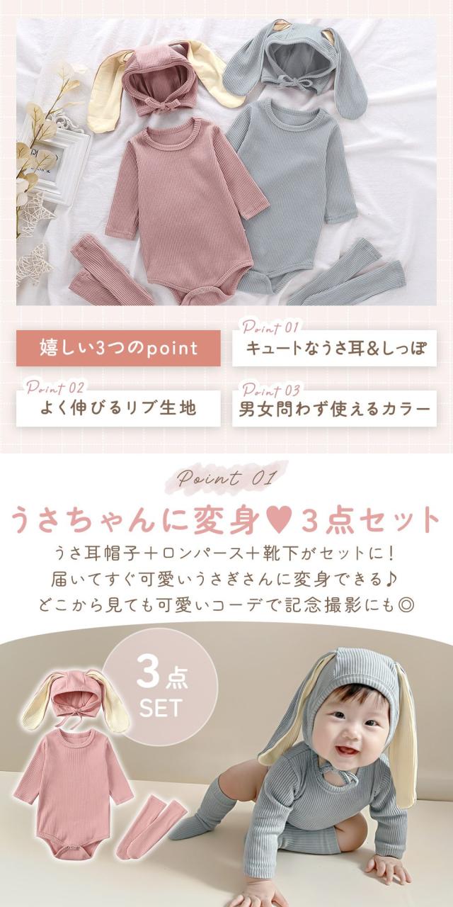 ロンパース/赤ちゃん/ベビー/かわいい/ウサギ/うさぎ/うさみみ/ウサ耳/帽子/靴下/3点セット/キュート/写真映え/リブ生地/女の子/男の子/男女兼用/伸縮性/たれみみ/ふわふわ/しっぽ/くすみカラー/スナップ/長袖/洗濯OK/冬/60/70/80/子ども/子供服/コスプレ/新生児/乳児/ベビー服/おしゃれ/着ぐるみ/ボンネット/出産祝い/秋/あたたかい/無地/