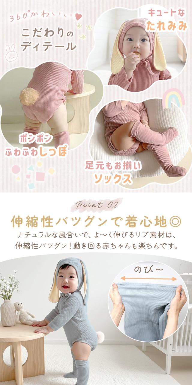 セットで着ればウサ耳が主役のキュートな印象に、帽子だけや靴下だけを合わせても可愛くまとまります。おうち時間のリラックスコーデ、保育園やお散歩などの外出、ちょっとしたコスプレ気分のイベントにも使いやすい子供服。赤ちゃんらしい愛らしさが引き立つコーデを楽しめます。