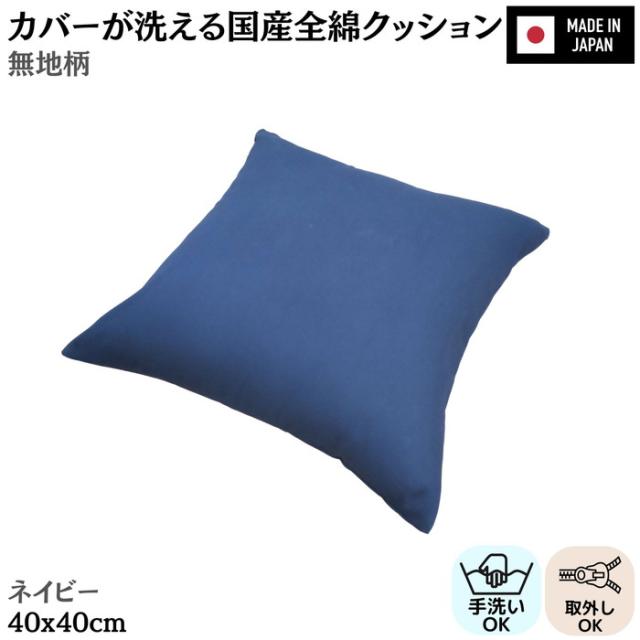 カバーが洗える国産全綿クッション 無地 ネイビー 綿100% 日本製 国産わた入れ加工 ファスナー付き