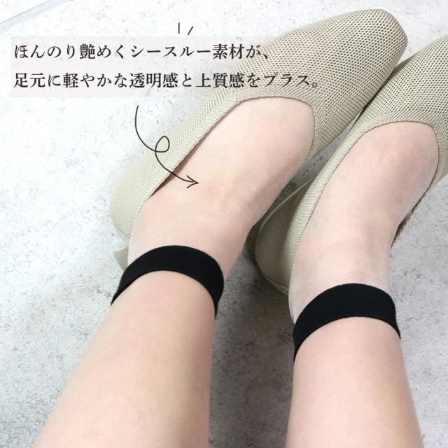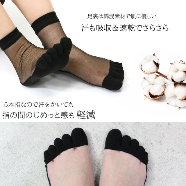 綿混素材の5本指ソックスならではのやわらかな肌ざわりで、一日中履いても心地よさが続きます。 ◆タイプ:5本指シースルーソックス