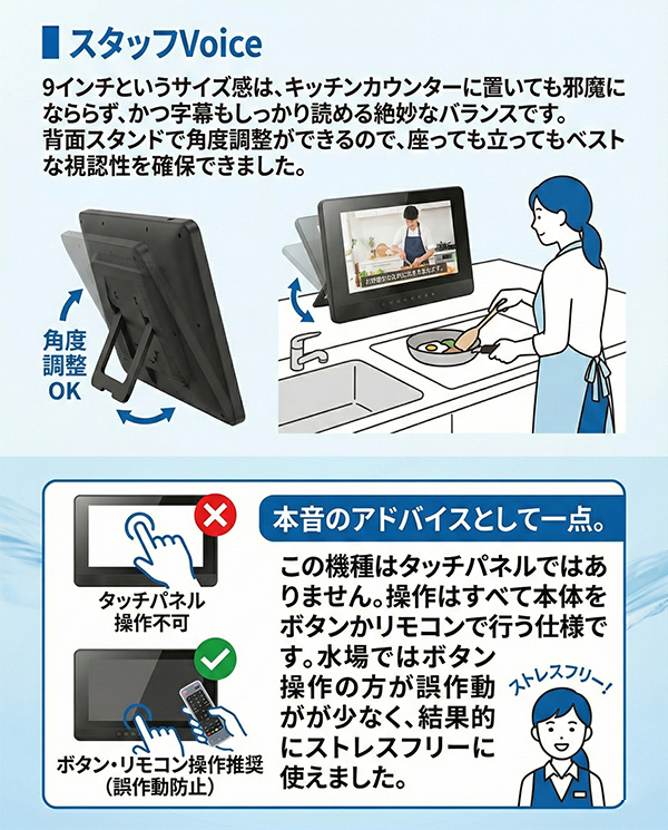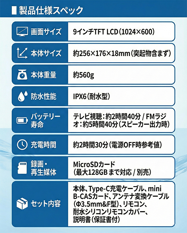 「お風呂やキッチンが特等席に。テレビ・ラジオ・録画・再生を、これ1台に凝縮」 家事の合間や、ゆったりとしたバスタイム、さらにはキャンプや車中泊まで。 「見たい番組があるけれど、場所を離れられない」「電波の届かない場所でもエンタメを楽しみたい」そんな悩みを1台で解決します。 ■ こんなシーンで活躍します ・お風呂で:防水IPX6仕様なので、シャワーの水しぶきを気にせずゆっくりとドラマ視聴。 ・キッチンで:レシピ動画を流したり、ニュースをチェックしながら効率よく料理。 ・屋外・防災に:バッテリー内蔵&FMワイドラジオ対応で、レジャーから万一の災害時まで情報を逃さない。 ━━━━━━━━━━━━━━━━ ■ 水回りを自由にする「IPX6」高防水設計 ━━━━━━━━━━━━━━━━ 本機は、あらゆる方向からの強い噴流水に耐える「IPX6」等級の防水性能を備えています。 濡れた手での操作はもちろん、水はねが気になるキッチンや浴室でも安心してお使いいただけます。 さらに、リモコンにも「耐水シリコンカバー」が付属。本体だけでなくリモコン操作も水回りでスムーズに行える実力派です。 ━━━━━━━━━━━━━━━━ ■ わずか18mm、驚きのスリムボディに凝縮された多機能 ━━━━━━━━━━━━━━━━ 厚さわずか約18mm、重量は約560gという軽量スリム設計ながら、エンタメ機能をフル装備しています。 ・地デジ録画機能:番組表から簡単に録画予約が可能(※MicroSD別売)。 ・メディアプレーヤー:動画・音楽・写真など、多彩なフォーマットの再生に対応。 ・フルセグ/ワンセグ自動切替:電波状況に応じて最適な受信モードを自動で選択します。 ━━━━━━━━━━━━━━━━ ■ スタッフVoice ━━━━━━━━━━━━━━━━ 「9インチというサイズ感は、キッチンカウンターに置いても邪魔にならず、かつ字幕もしっかり読める絶妙なバランスです。背面スタンドで角度調整ができるので、座っても立ってもベストな視認性を確保できました。」 「本音のアドバイスとして一点。この機種はタッチパネルではありません。操作はすべて本体ボタンかリモコンで行う仕様です。水場ではボタン操作の方が誤作動が少なく、結果的にストレスフリーに使えました。」 ━━━━━━━━━━━━━━━━ ■ ご購入前に必ずご確認ください(レビュー★1防衛) ━━━━━━━━━━━━━━━━ 長く、安全にお使いいただくために、以下の物理的特性をご理解ください。これらは製品の仕様であり、故障ではありません。 ・充電について:本機は専用規格を採用しているため、必ず「付属のType-Cケーブル」をご使用ください。市販の高速充電器(2.1A以上)やケーブルでは、充電ランプがついていても給電されない場合があります。 ・テレビ受信について:ポータブルアンテナの特性上、電波環境(建物の中や地下など)によっては受信が不安定になる場合があります。安定した視聴には、付属の変換ケーブルを用いた壁面アンテナ端子への接続を推奨します。 ・液晶パネル:本機はタッチパネルではありません。付属のリモコンまたは本体スイッチにて操作してください。 ━━━━━━━━━━━━━━━━ ■ 製品仕様スペック ━━━━━━━━━━━━━━━━