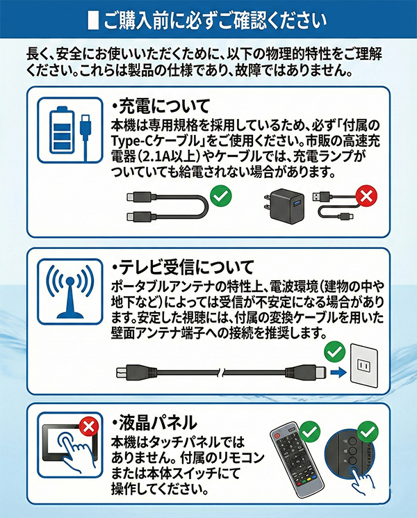 ━━━━━━━━━━━━━━━━ ■ どこでも自由なエンタメ体験を ━━━━━━━━━━━━━━━━ 薄型・軽量・防水。この3つが揃うことで、あなたの生活動線のすべてがエンタメ空間に変わります。 専用ケーブルでの充電やアンテナ環境といった「ポータブル機ならではの特性」をご理解いただければ、これほど心強い相棒はありません。 今日から、お風呂やキッチンをもっと楽しい場所に変えてみませんか。 |