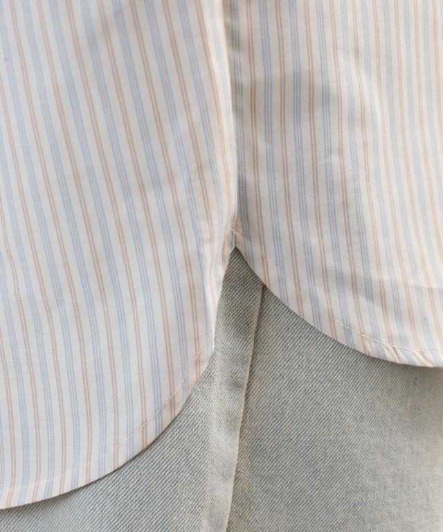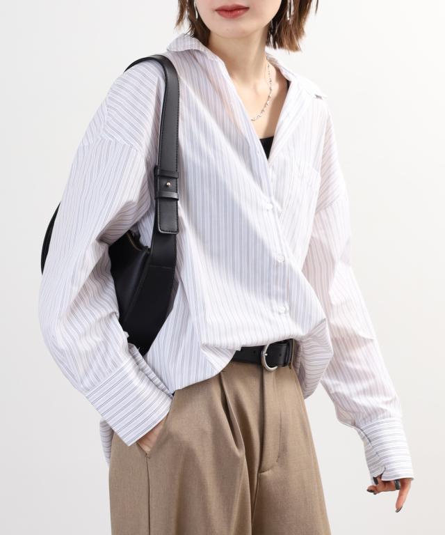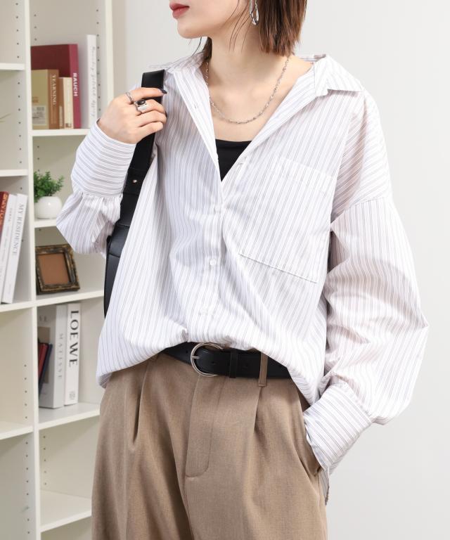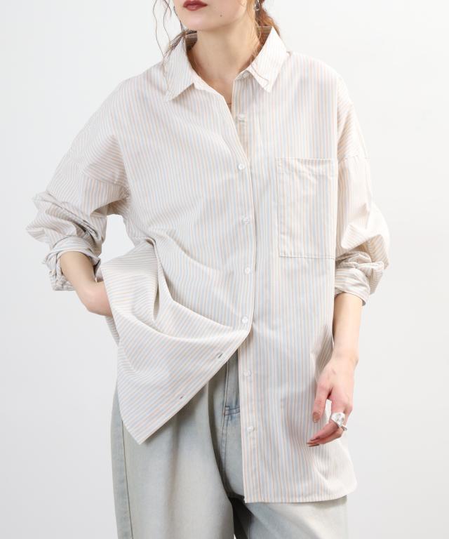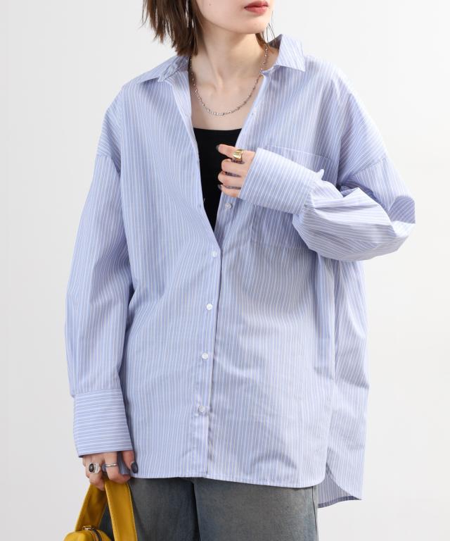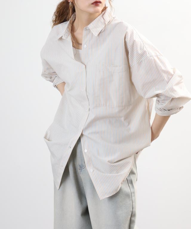 | 縦ラインをすっきり見せるストライプ柄と、ゆとりのあるシルエットが印象的なロング丈ビッグシャツ。ヒップラインをカバーする長めの着丈とボリュームスリーブの組み合わせで、体のラインを拾いにくく、リラックス感のある着こなしに取り入れやすい一枚です。 肩を落としたドロップショルダーと広めの身幅が、抜け感のあるシルエットを演出。前後差の少ないラウンドヘムにサイドスリットを入れることで、前だけインしたスタイリングや羽織りとしての着用にも対応します。胸ポケットや長めのカフスデザインがさりげないアクセントになり、シンプルなコーデにも取り入れやすい仕上がりです。 素材はポリエステルと綿をブレンドしたTCブロード生地を使用。軽やかで扱いやすく、デイリーコーデに取り入れやすい風合いが特徴です。デニムやワイドパンツでカジュアルに、スラックスやタイトスカートと合わせてオフィス寄りのスタイルにもアレンジしやすく、着回しの幅を広げてくれます。 【サイズ】F 着丈:79cm/バスト:130cm/肩幅:65cm/袖丈:50cm/裾幅:125cm 【素材】ポリエステル80%・綿20% 【原産国】中国 |