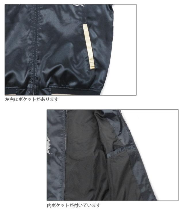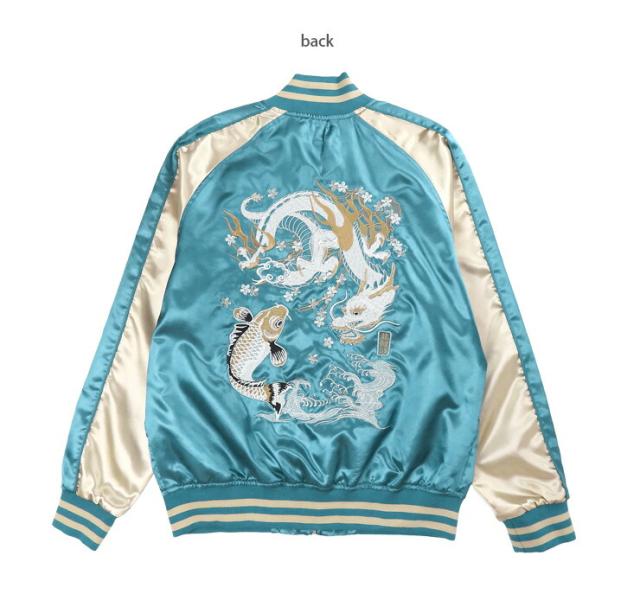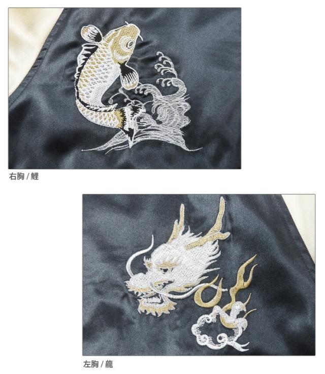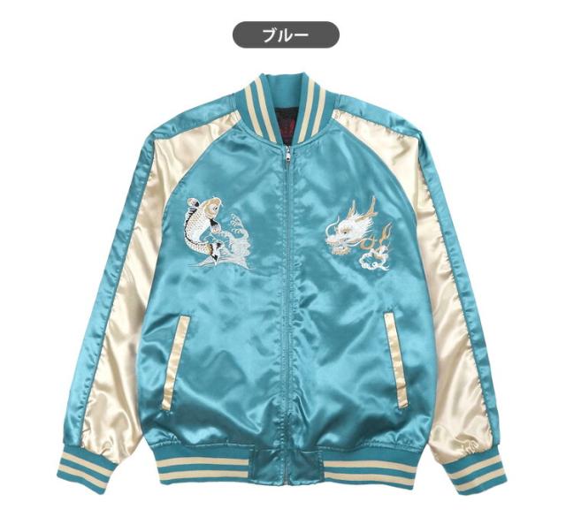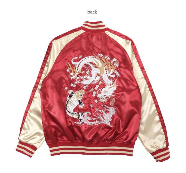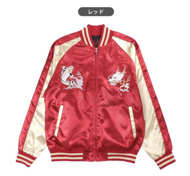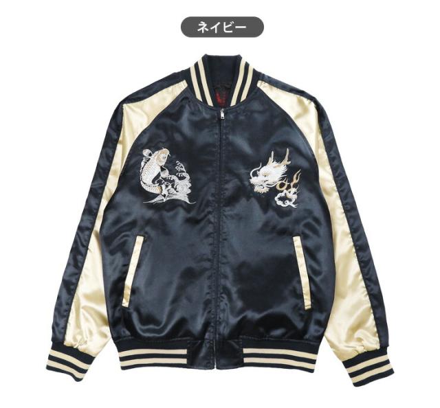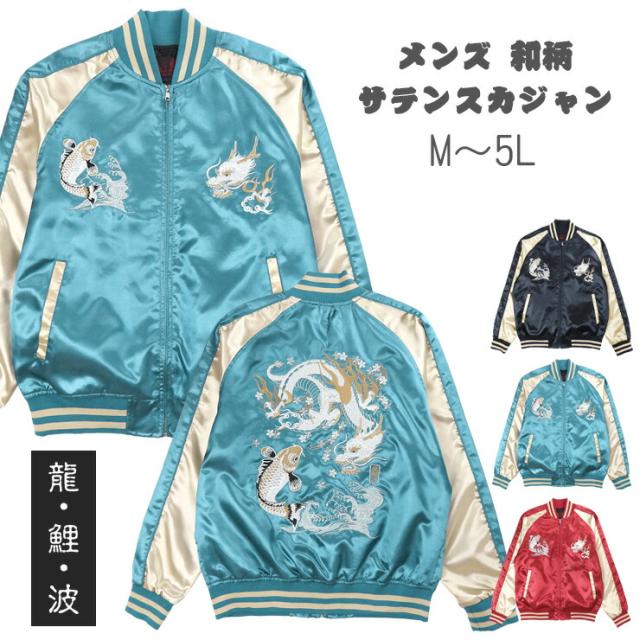 龍鯉波柄 サテン スカジャン メンズ 春秋冬 M L XL 3L 4L 5L 長袖 53611 53611K ネイビー ブルー レッド 一心如鏡 紳士 男性 和柄 和風 竜 ドラゴン カープ ウェーブ 本刺繍 ポケット NAVY BLUE RED 【大きいサイズあり】3128