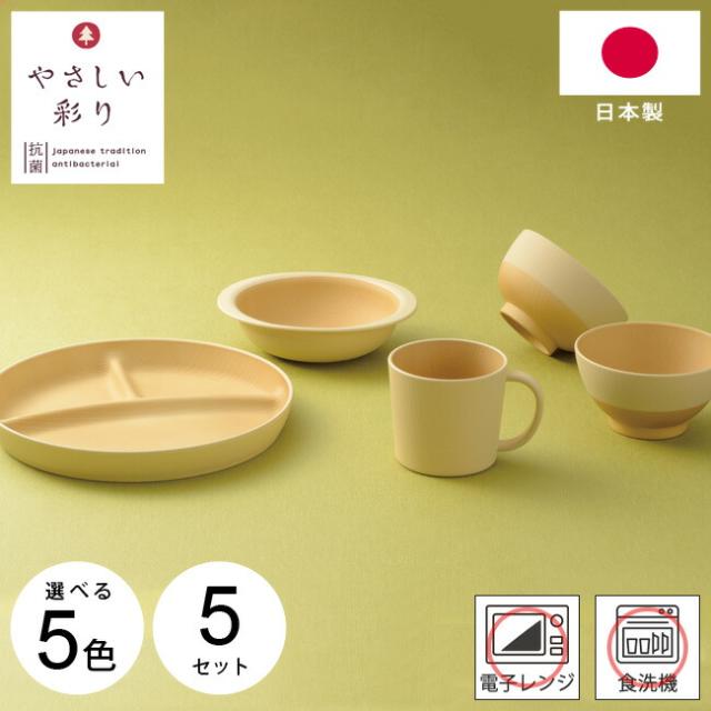 食器 5点セット キッズ 子ども やさしい彩り 5色展開 日本製 ギフト 汁椀 飯椀 マグ プレート ボウル お茶碗 お皿 コップ 木製風 抗菌 木目調 北欧 和 モダン おわん 軽量 電子レンジ対応 食洗器対応 くすみカラー ナチュラル 御祝 出産祝い プレゼント 送料無料