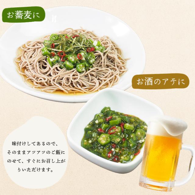 めかぶに加えて、おくら・モロヘイヤ・山芋を合わせ、旨味を引き立てる醤油風味で仕上げました。唐辛子入りなので、ピリッと味が引き締まっておいしい。