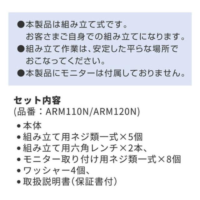 セット内容 本体、組み立て用ネジ類一式×5個、組み立て用六角レンチ×2本、モニター取り付け用ネジ類一式×8個、ワッシャー4個、取扱説明書(保証書付)