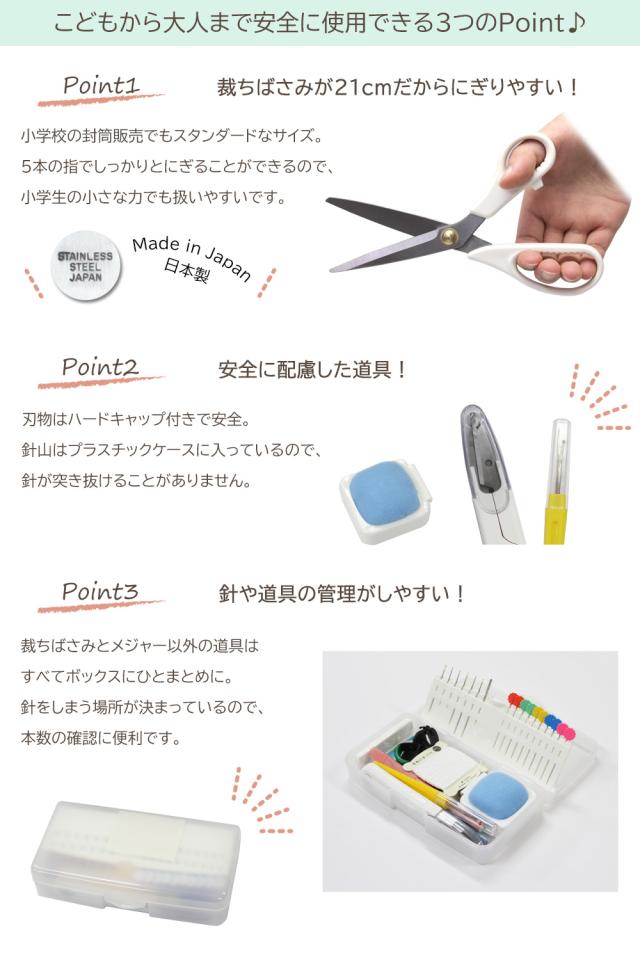 ◆キャップ付の糸きりばさみ、プラスチックケース入りの針山など安全面を考慮しております。