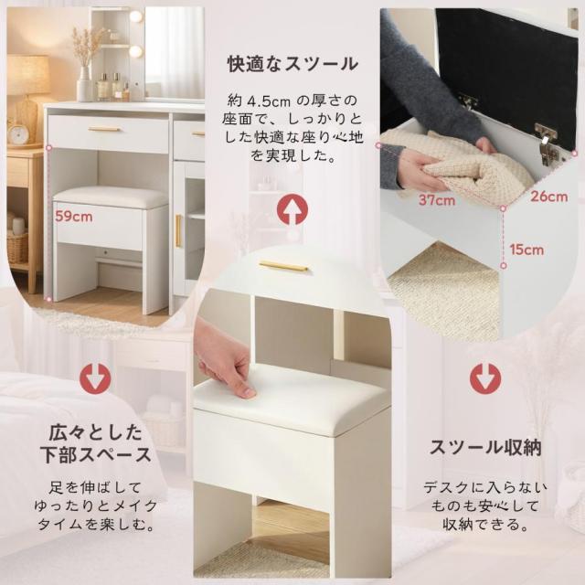 【多機能収納設計】2つの引き出しと透明収納付きサイドキャビネットを備え、メイク道具を整理収納でき、収納付きスツールで小物もスッキリ収められます。