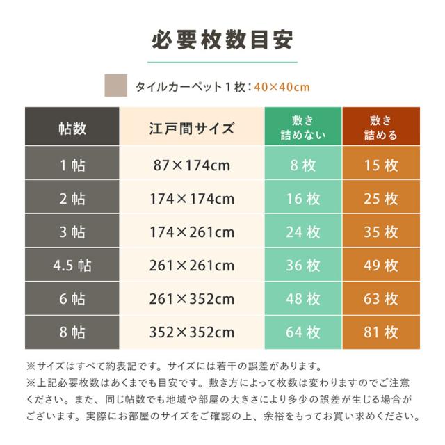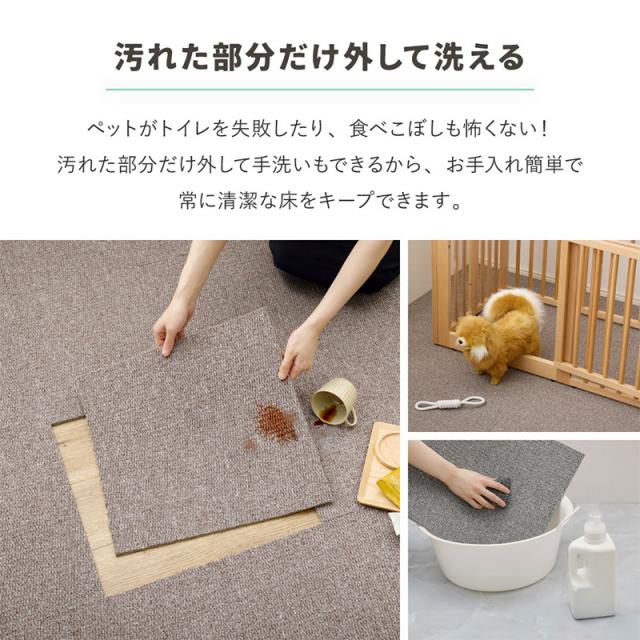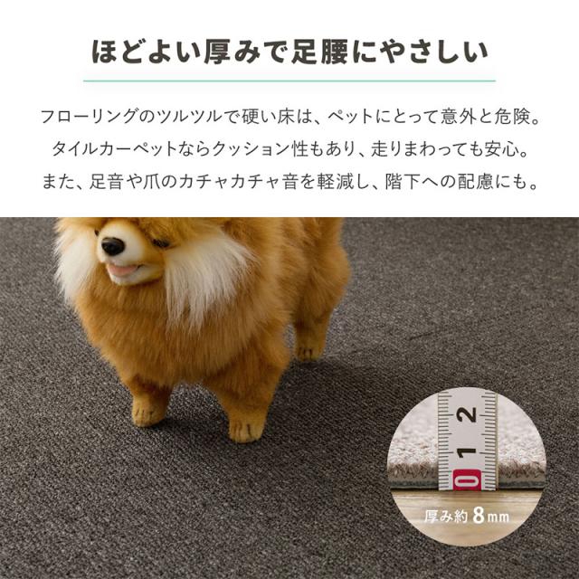 置くだけ簡単、滑りにくいタイルカーペット ●置くだけでピタッと密着するTPR素材を使用 ●吸着タイプのように貼り付かずフィルム剥がしも不要 ●程よい厚みとクッション性で足腰への負担をやわらかく軽減 ●ペットの足元対策としても取り入れやすい仕様 ●汚れた場合は洗えて清潔に保ちやすい ●毛や汚れが目立ちにくい ●人とペットが一緒に過ごす空間にも自然になじむ ●カット調整もできケージ周りや通り道にも使いやすく必要な場所に必要な分だけ敷いて使えるタイルカーペット ●製品仕様 サイズ:約40×40cm 素材:表面:ポリプロピレン、裏面:TPR[熱可塑性ゴム] 生産地:中国 注意事項:同色20枚のセット販売です。 備考:手洗いOK、ホットカーペット・床暖房 非対応 ※お客様組立て品につきましては、組み立て後に不良の連絡をされても対応ができません。組み立て前にパーツに不良・傷等がないか、必ずご確認下さいますようよろしくお願い申し上げます。 ※記載は商品仕様の一部です。仕様説明不足等の理由での返品はできません。特に適合等は必ずご確認ください。