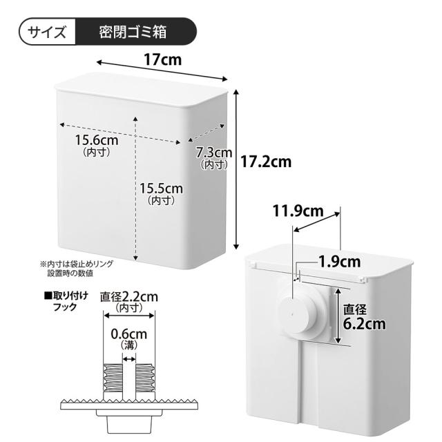 内寸サイズ(約):本体/W15.6×D7.3×H15.5cm 取り付けフック/溝幅0.6cm・ネジ部直径2.2cm 固定キャップ/直径6.2×幅1.9cm