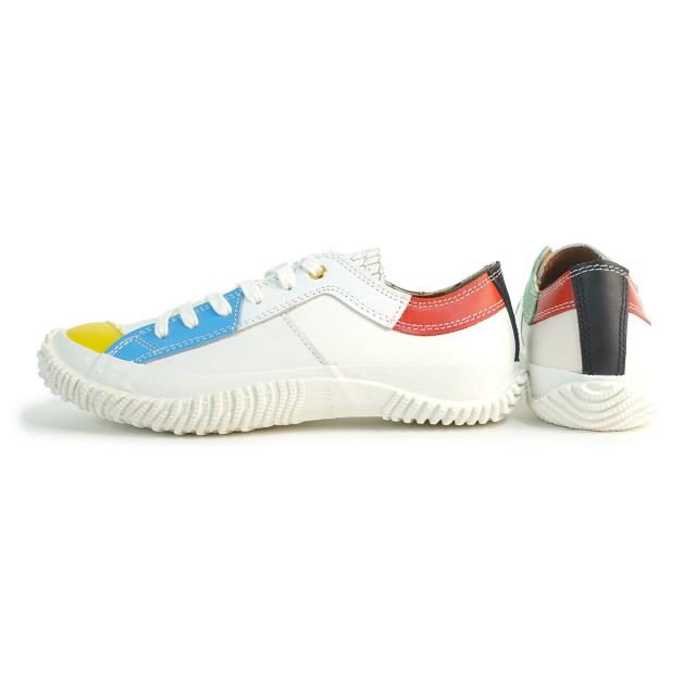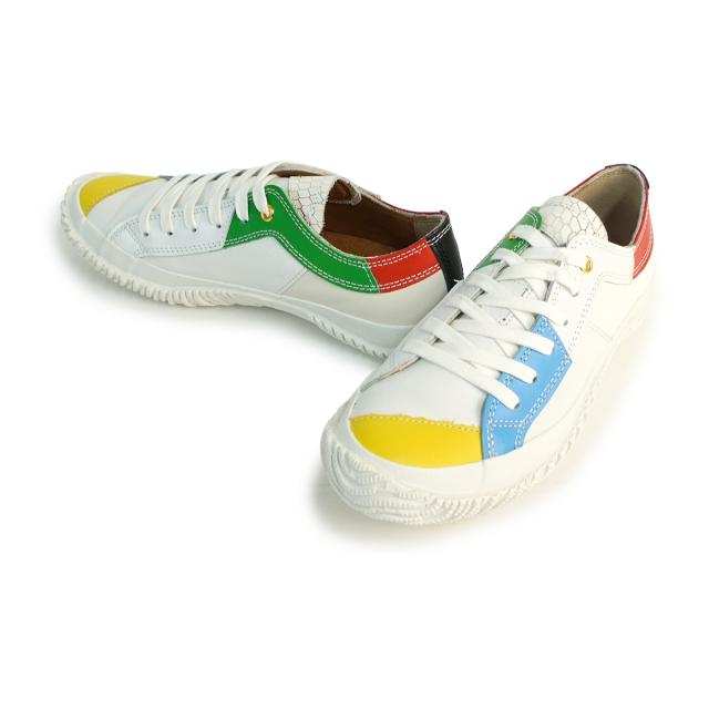 SPINGLEの代名詞とも言える定番モデル「SP-110」をベースに、カンガルーレザーと牛革という異なる質感の素材を巧みに組み合わせたローカットモデル。 WhiteをベースにBlue、Yellow、Green、Red、Black、Ivoryの7色を用いたパッチワークが、爽やかに彩り足元にリズムと奥行きを生み出します。