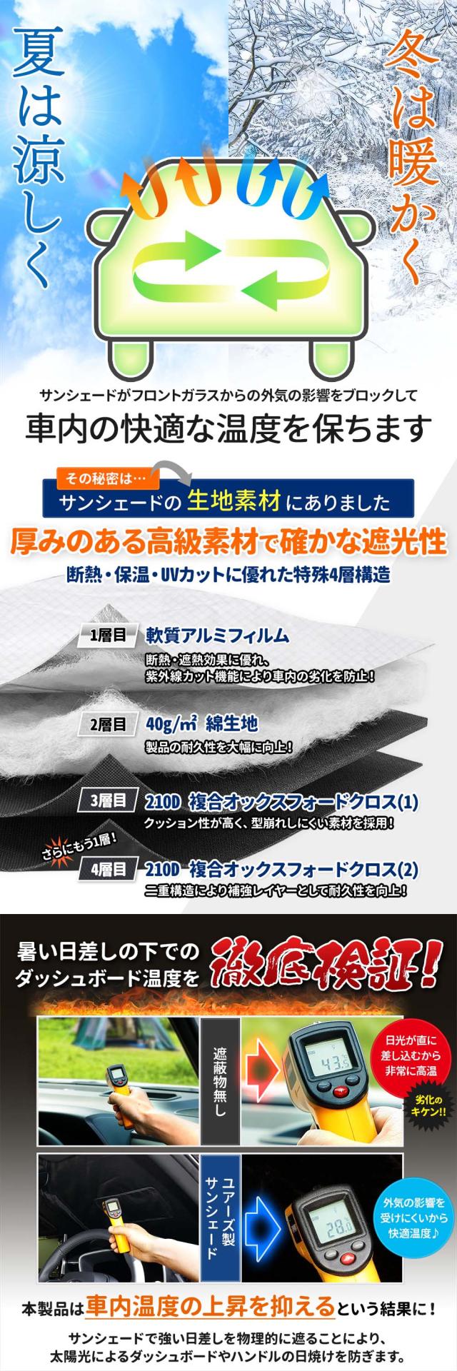ホンダ ステップワゴン RP6 RP7 RP8 専用設計だからぴったりフィット! 断熱・保温・UVカットに優れた高級素材の特殊4層構造採用し確かな遮光性で外気の影響をブロック! ●細部までこだわり抜いた専用設計 汎用ではなく、ホンダ ステップワゴン RP6 RP7 RP8 専用のポップアップサンシェード! 専任スタッフが何度も微調整を行い商品化しているしているので、サイズはピッタリ! また、取り付けやすくコンパクトに収納しやすいデザインに仕上げております。 ●紫外線カット! 高級素材を使用しており、紫外線をしっかりと遮断して高い断熱能力を発揮します。 駐車時間の車内気温上昇を大幅に抑制したり、車内の内装やシートの劣化、熱変形なども防ぎます。 社内側は黒にしたリバース構造にすることで紫外線や熱エネルギーの反射効果を向上します! ●高級素材の特殊4層構造採用 軟質アルミフィルム、40g/? 綿生地、2層の210D 複合オックスフォードクロスを使用し、快適なフィット感と確かな遮光性を両立させることができました。 |