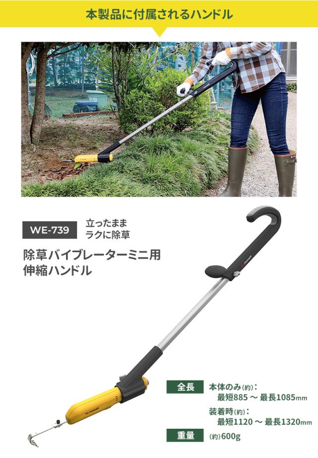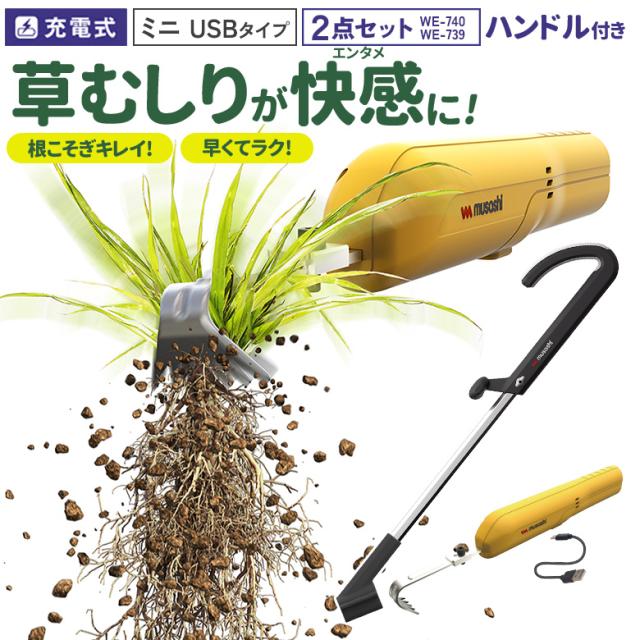 草刈り機 雑草抜き ムサシ 充電式 除草バイブレーターミニ USBタイプ ハンドル付き(WE-740/WE-739) 草取り 草むしり 草抜き 振動除草 除草機 ガーデニング 園芸用品 雑草 畑 庭 手入れ 花 ガーデン DIY コードレス コンパクト