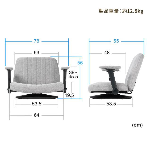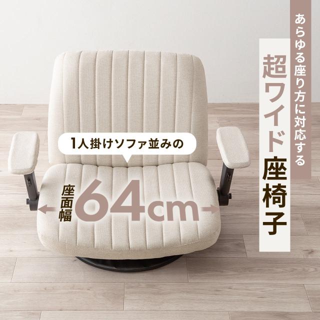 ⇒ご購入の前にご確認下さい座面はやさしい布張りで、快適な座り心地の座椅子。座面サイズは、あぐらをかいてもゆったり座れる幅64×奥行48cm。高反発クッションを採用し、快適な座り心地。肘は上下左右・前後に可動し、好みに合わせて調整可能。使用しない時は邪魔にならない跳ね上げ式。肘カバー付きで、取り外して洗濯できます。向きの移動がスムーズな回転盤付き。【WEB限定商品】