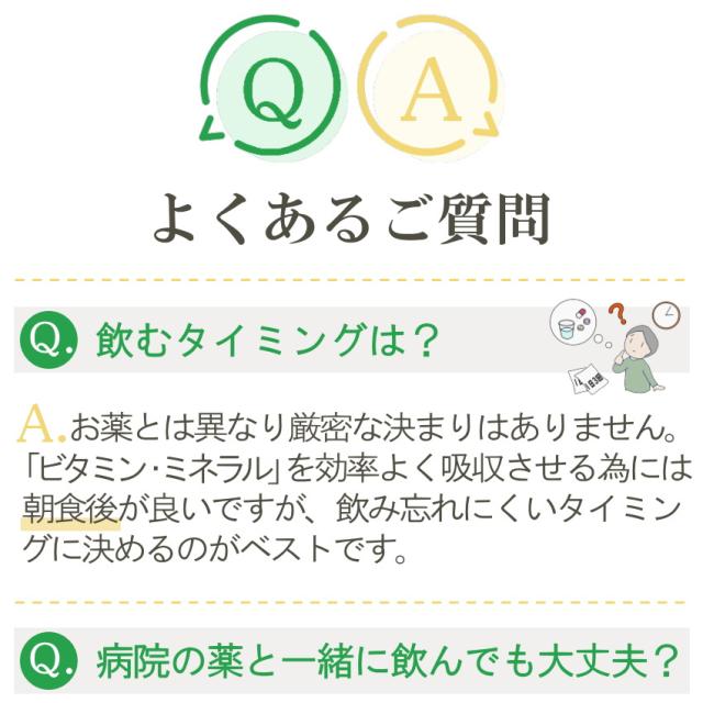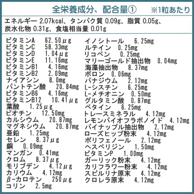| 栄養成分配合量 | 1粒(0.604g)あたり:エネルギー 2.07kcal、タンパク質 0.09 g、脂質 0.05 g、炭水化物 0.31g、食塩相当量 0.01 g、ビタミンA 62.5μg、ビタミンC58 mg、ビタミンD3 1.0μg、ビタミンE、11.2 mg、ビタミンB1 4.2 mg、ビタミンB2 2.1 mg、ナイアシン 8 mg、パントテン酸20.8 mg、ビタミンB6 4.2mg、ビタミンB12 10.4μg、葉酸 33μg、ビオチン13μg、 カルシウム 21 mg、マグネシウム 21 mg、亜鉛 1.3mg、セレン 8μg、銅 0.1mg、マンガン 0.4 mg、クロム 8μg、モリブデン4μg、カリウム 4mg |