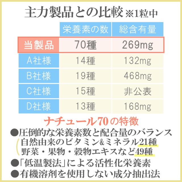 ナチュール70は、食事で不足しがちな栄養素を総合的に補給できるよう設計されています。