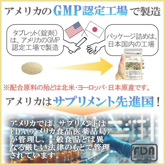 ●ナチュール70のタブレット(錠剤)は、アメリカのGMP認定工場で完成品が製造され、日本国内の専門工場でパッケージ詰めされます。