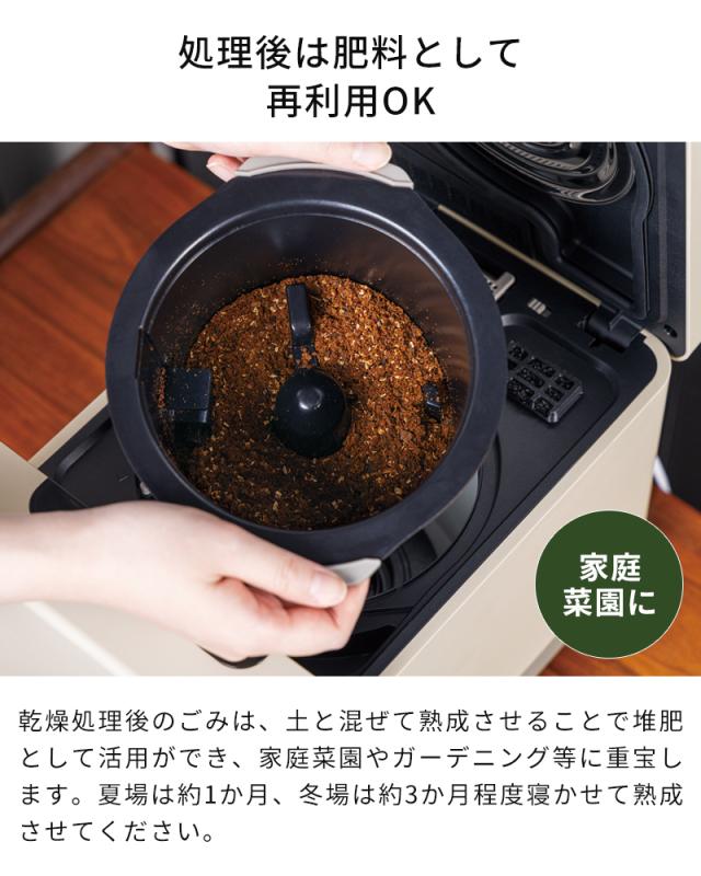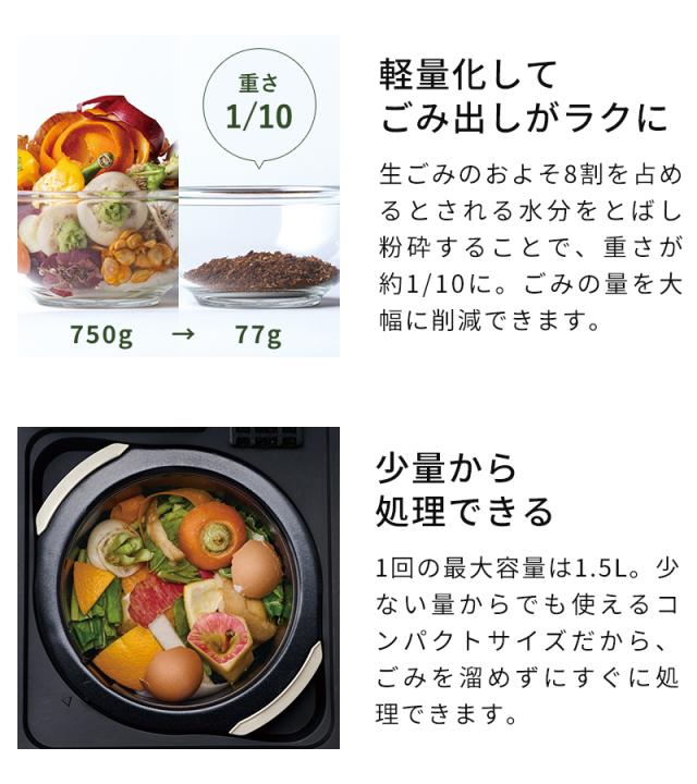 乾燥+粉砕式でずっしり重い生ごみを軽量化できる、recolte(レコルト)の生ごみ処理機にコンパクトサイズが登場。調理中や食後に出る生ごみを、ゴミ箱に捨てるような感覚で入れるだけ。容量約1.5L、2〜3人分の1日に出るとされる生ごみをまとめて処理できます。余分な水気をとばして生ごみを小さく軽くするので、ごみ出しもラクラク。処理後のごみは、ガーデニングや家庭菜園の肥料として再利用も可能です。