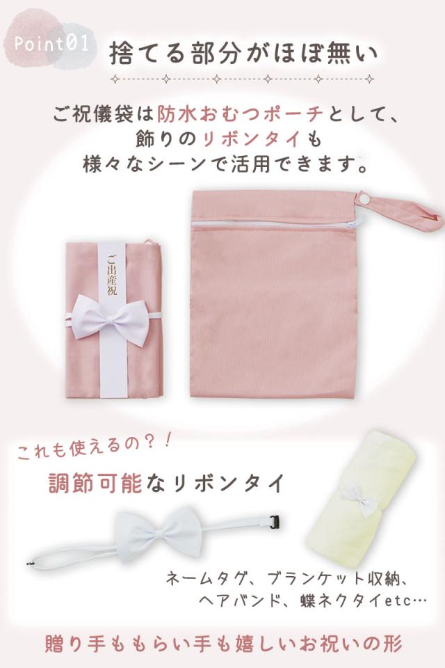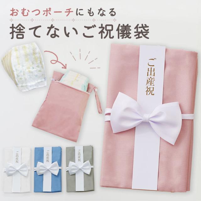 お祝いを渡すその日は正式なご祝儀袋として使用でき、短冊と中袋も付属しています。贈ったあとはおむつポーチとして使える実用的なアイテムです。