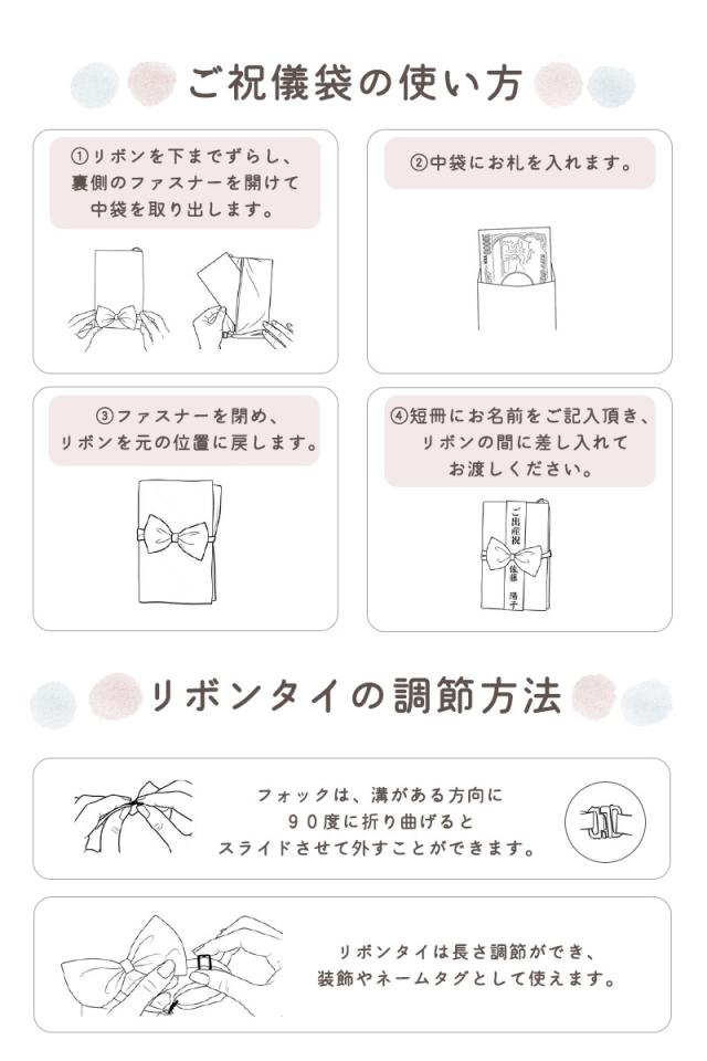 ・ご祝儀ポーチ ×1 ・リボンタイ ×1 ・短冊 ×2種 ・中袋 ×1 ・説明書 ×1 届いてすぐにご祝儀袋として使用できます。 |
