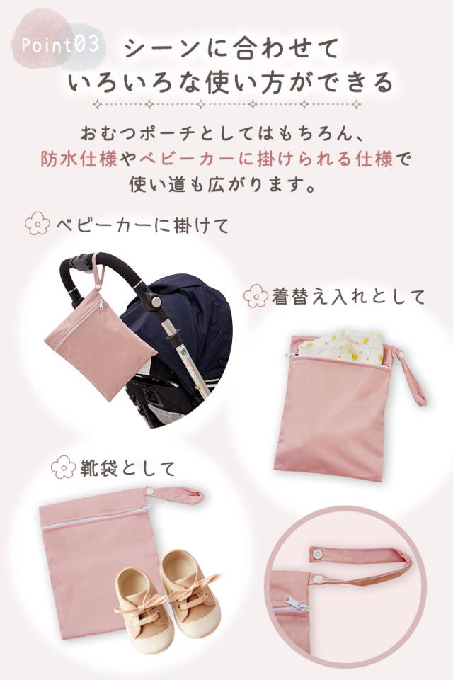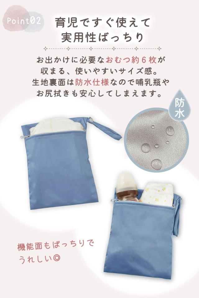 ポーチは防水仕様で、おむつ約6枚のほか、おしり拭きや着替えなども収納できます。お出かけ時のベビーグッズをまとめて持ち運びできる便利なサイズです。