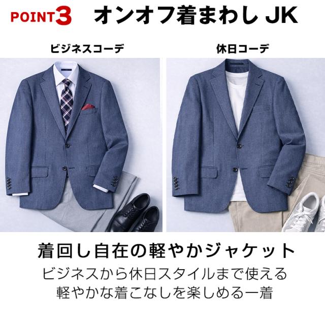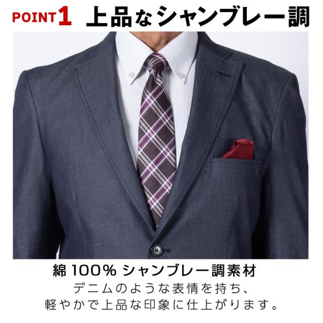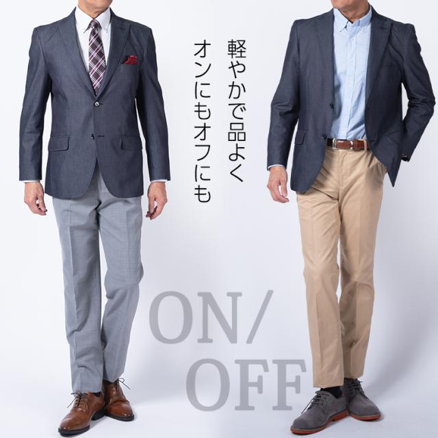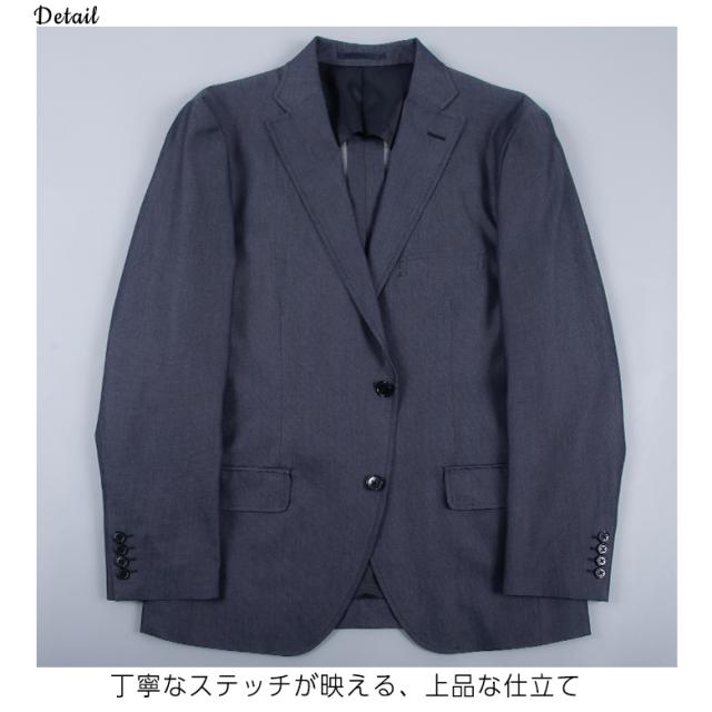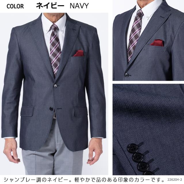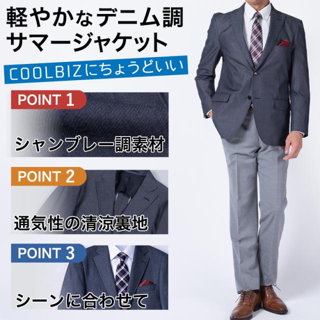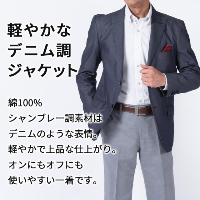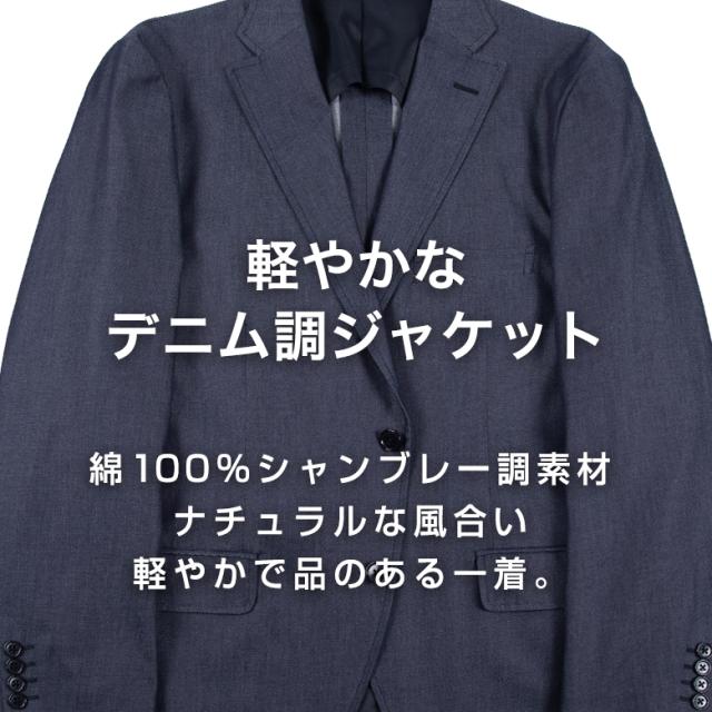 【キーワード】 ジャケット シングル2つボタン 春夏 秋 スリーシーズン 綿100 シャンブレー デニム調 紳士服 ビジネス オフスタイル ブレザー 上着 テーラードジャケット メンズ COOL BIZ クールビズ 通勤 オフィス ビジカジ ジャケパン 旅行 ゴルフ ブルー 青 涼感 爽やか 紺 濃紺 ネイビー