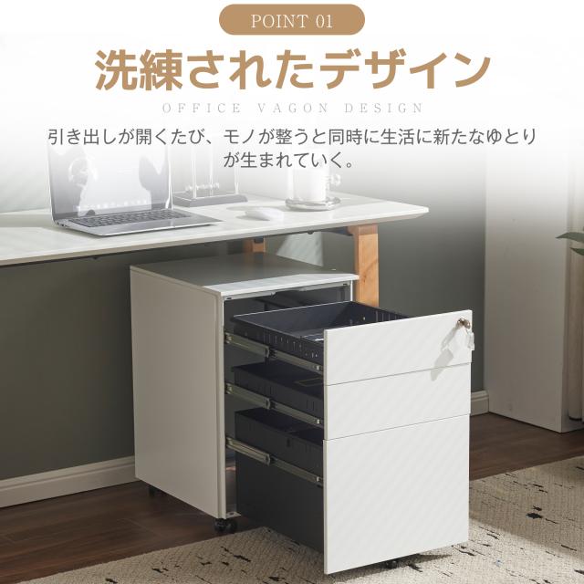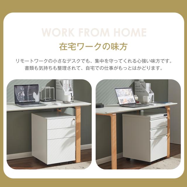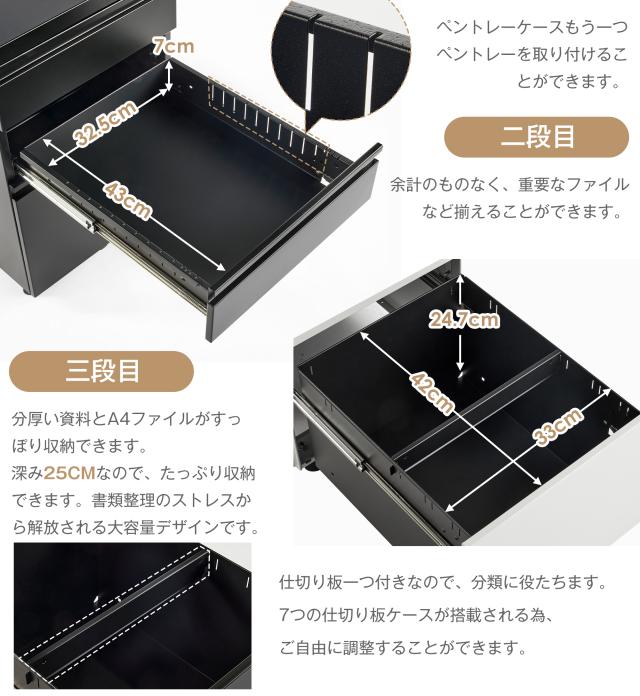 2. 【たっぷり収納できる!大満足の収納容量】用途によって使い分けできる3段の引き出し。まとめて、スッキリ。ファイル、文具、ノート、雑誌などをまとめて収納!細かく整理できるので取り出しやすいのが利点です。3段目は、A4ファイルがすっぼり納まります。着脱可能な仕切り板付きで、分類に役立ちます。効率よく整理できる同時に、充分な作業スペースも保証します。