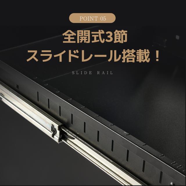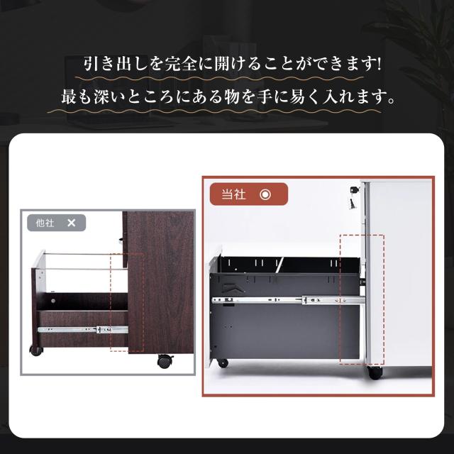 4.【前倒れ防止】引き出しには重くなると「ガタっ」と大きく傾くものがあります。しかし「フリーク」はキャスターを取り付けことで悩みを解消しました。