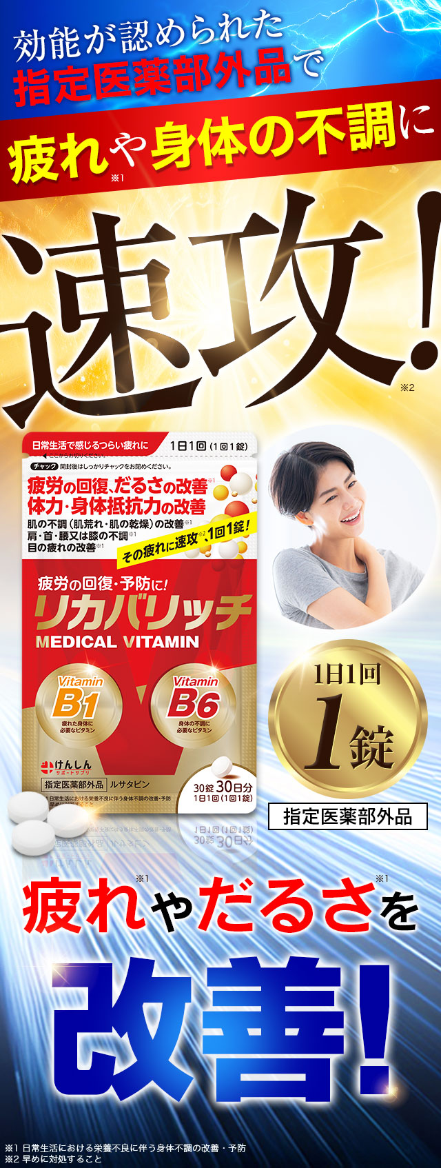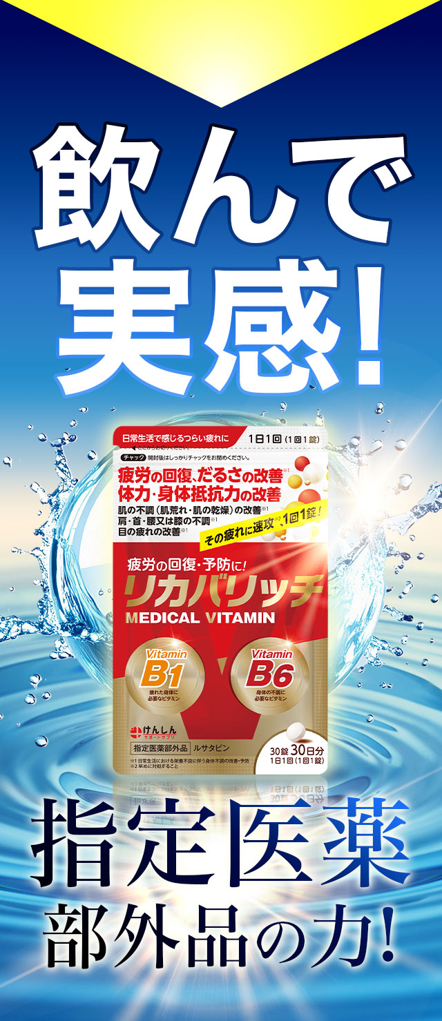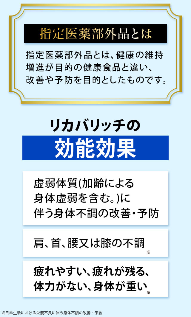 『リカバリッチ』は、効能が認められた「指定医薬部外品」で、疲れや身体の不調(※日常生活における栄養不良に伴う身体不調の改善・予防)に速攻(※早めに対処すること)!