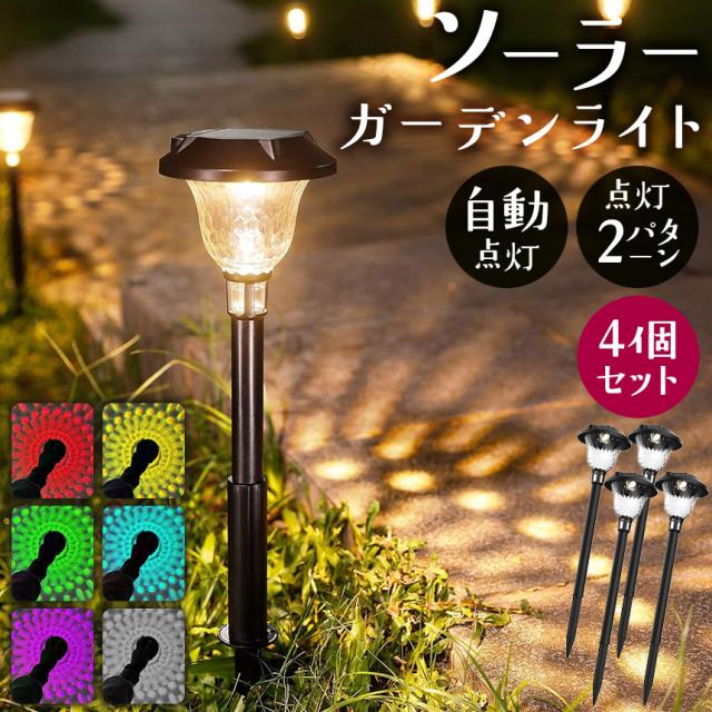 ソーラーライト 4個セット ガーデンライト 屋外 防水 長時間 おしゃれ ライトアップ LED イルミネーション 自動点灯 太陽光充電 埋め込み 挿し込み 庭 玄関 芝生 花壇 照明 電気代0円 トーチライト カラフル ライト 幻想的 かわいい 綺麗 センサー 電球色