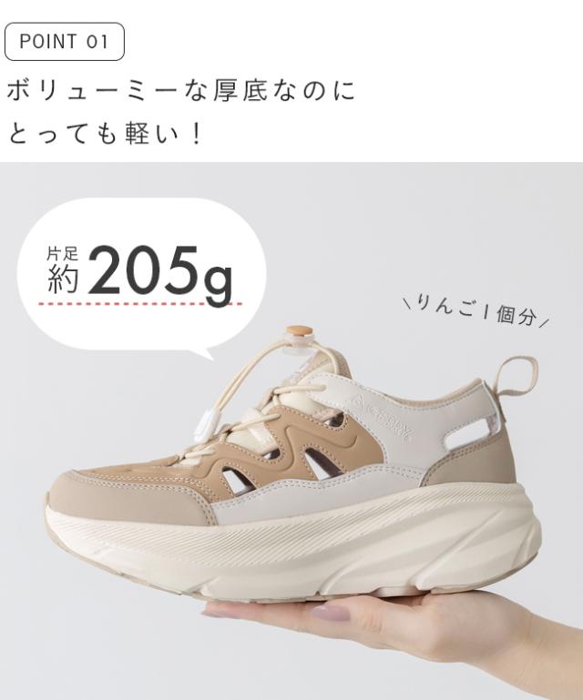 なんと重さは片足205g(M(23.0〜23.5cm)計測)!と見た目のボリューム感とは裏腹にとっても軽い履き心地。