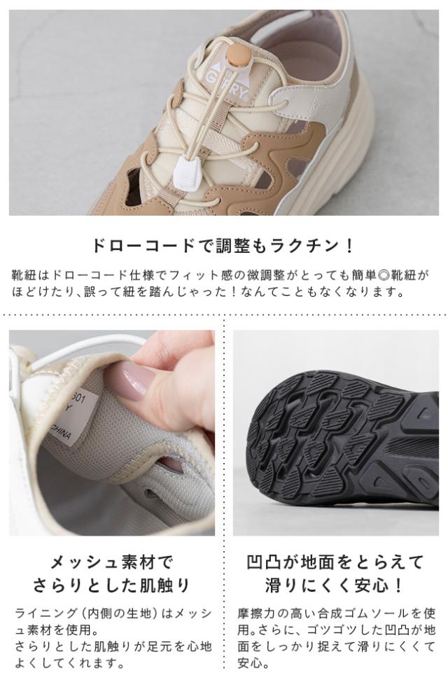GERRY ジェリー スニーカー ベーシックスニーカー ローカットスニーカー ローカット 短靴 レースアップ 紐あり 紐 シューレース カジュアルシューズ フラットシューズ ぺたんこ靴 レディース ラウンドトゥ ラウンド ドローコード 甲ストラップ メッシュ ボリュームシューズ サンダル スニーカーサンダル ボリュームソール ごつめ 重ため 厚底 ラウンドヒール 軽量 軽い 超軽量 蒸れにくい 蒸れない むれにくい すべりにくい 痛くない 歩きやすい 疲れない 疲れにくい 幅広 アウトドア キャンプ 山 川 カジュアル旅行 トラベル 帰省 旅行 レジャー フェス おでかけ お出かけ カフェ ショッピング 買い物 お迎え 公園 送り迎え 子育て 子連れ 屋外 外履き デイリー 日常 普段使い 日常使い 普通履き ドライブ 運転 車 ドライビングシューズ 5.5cmヒール 5.5センチヒール ミドルヒール 4E 黒 ブラック 灰 グレー 肌色 ベージュ M 23cm 23.5cm 2L LL 25cm 25.5cm L 24cm 24.5cm 春 夏 秋 冬 スムース調 合皮 PU wellegselect ウェレッグセレクト outletshoes アウトレットシューズ welleg ウェレッグ