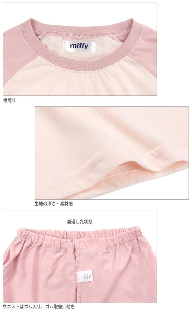 miffy(ミッフィー)のキッズ用ルームウエア上下セット。大人気キャラクターのプリントが可愛いデザイン。お肌に優しい綿混素材でお子様のパジャマにピッタリです。パンツウエストはゴム取替口が付いています。