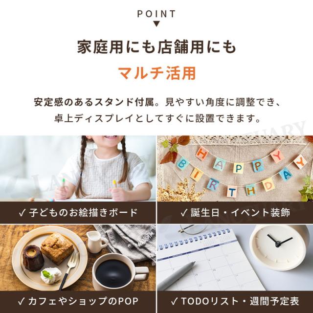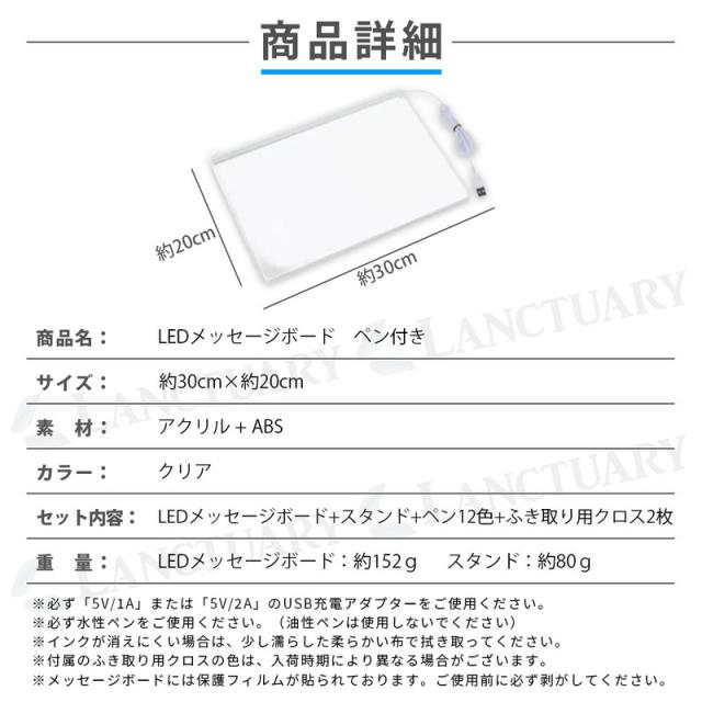 | 主な仕様 | 商品名:LEDメッセージボード ペン付き サイズ:約30cm×約20cm 素材:アクリル、ABS 重量:ボード約152g、スタンド約80g 電源:USB給電(5V/1Aまたは5V/2A) セット内容:本体、スタンド、ペン12色、クロス2枚 注意:水性ペン専用、保護フィルムを剥がして使用 |