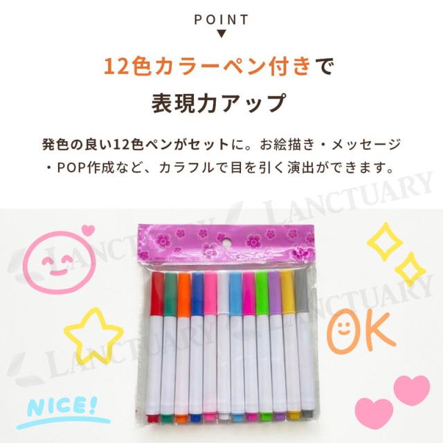 12色のペンと拭き取りクロスがセットになっており、他に買い足す手間はありません。おうちカフェのメニューや、誕生日のデコレーション、ToDoリストの管理など、使い道はアイデア次第で多岐にわたります。明るいインクが光をしっかり拾うため、少し暗い場所でも文字がはっきり目立ちます。