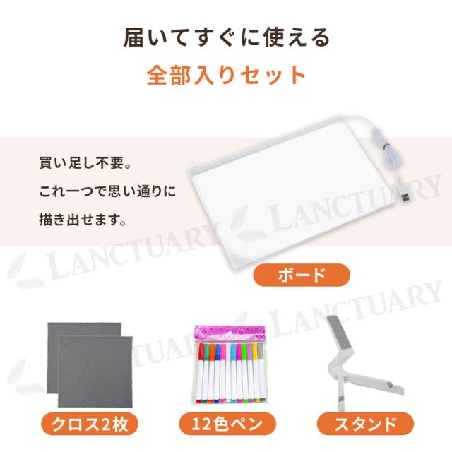 | 商品の説明 | 柔らかな光でお部屋を彩る、LED内蔵のアクリルメッセージボードです。透明なパネルに文字を書くと、光がラインに沿って鮮やかに浮かび上がります。ただのメモ書きが、スイッチを入れた瞬間に特別なインテリアに変わる体験を楽しめます。 セットには発色の良い12色のカラーペンを同梱しました。届いたその場ですぐに、カラフルなお絵描きやお店の看板作りをスタートできます。安定感のある専用スタンドは角度を自由に変えられるため、デスクや棚の上、お店のレジ横など、場所を選ばず最適な状態で設置可能です。 電源は使い勝手の良いUSB給電式を採用しました。スマホの充電器やPCに繋ぐだけで、コンセントがない場所でも気軽に点灯できます。また、専用クロスが2枚付いているので書き直しもスムーズです。サッと拭くだけで簡単に消せるため、何度でも新しいアイデアを形にできます。汚れが気になった際は、少し濡らした布で拭けば元のクリアな状態に戻ります。 紙を消費する必要がないため、環境に優しく経済的です。お子様の知育ツールとしてはもちろん、カフェのメニュー案内や家族への伝言板にも活用できます。夜には間接照明としても機能し、どんなインテリアにも自然に馴染みます。毎日のコミュニケーションを、温かな光でより楽しく彩るアイテムです。 |