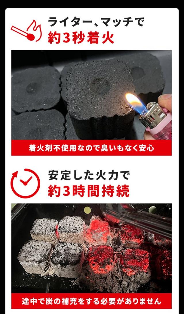 | あっという間に着火!着火剤不要! 火起こし不要で、誰でも簡単にバーベキューが楽しめる「炭革命」BBQ用木炭。 ライターやマッチで数秒着火し、約3分で安定した火力に到達。 炎が出にくい設計で安全性が高く、初心者や女性でも扱いやすいのが特長です。 約3時間の長時間燃焼で、途中の炭の追加が不要。 一定火力で均一に加熱できるため、食材が焦げにくく美味しく焼き上がります。 3個ずつの個包装タイプで、必要な分だけ使えて持ち運びも便利。 湿気に強く、保管しやすいコンパクト設計。 油が落ちても自然発火しにくく、安心して使用できる新しいタイプの木炭です。 自宅の庭先で七輪で焼き鳥を焼いたり、キャンプなどのアウトドアシーンはもちろん、非常用の備蓄として防災用品としても重宝します。 |