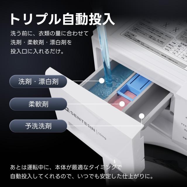 ◎03【トリプル自動投入】洗う前に、衣類の量に合わせて洗剤・柔軟剤・漂白剤を投入口に入れるだけ。あとは運転中に、本体が最適なタイミングで自動投入してくれるので、いつでも安定した仕上がりに。