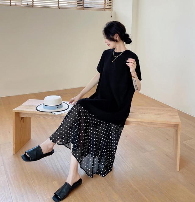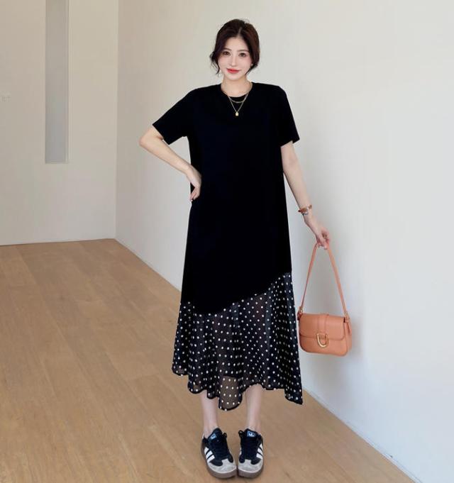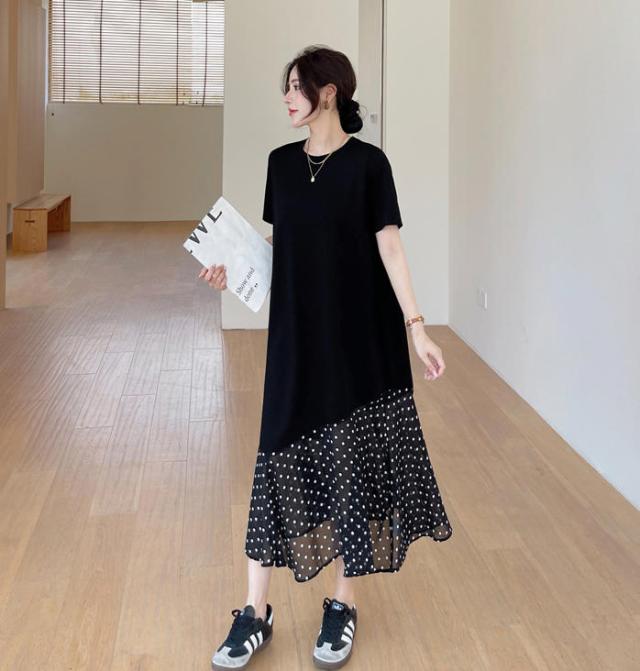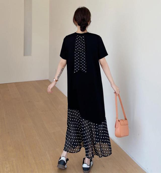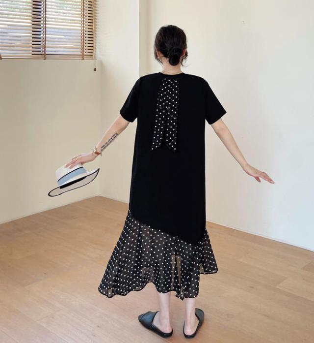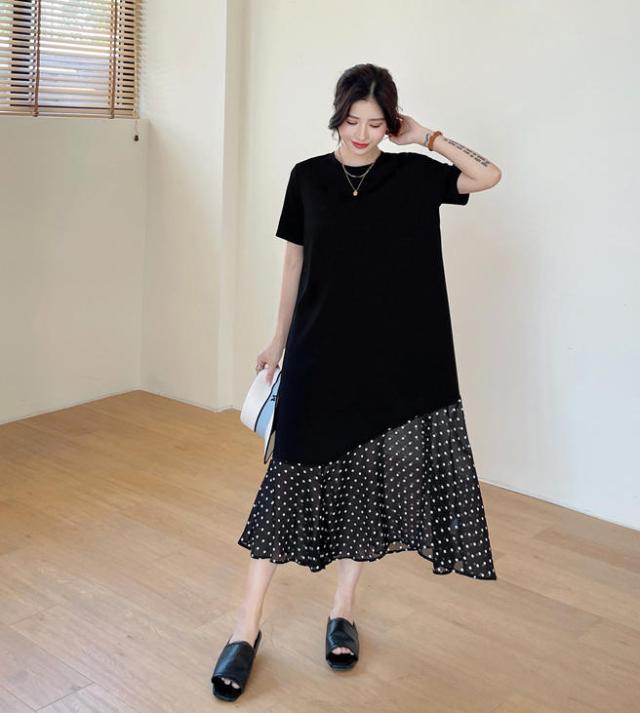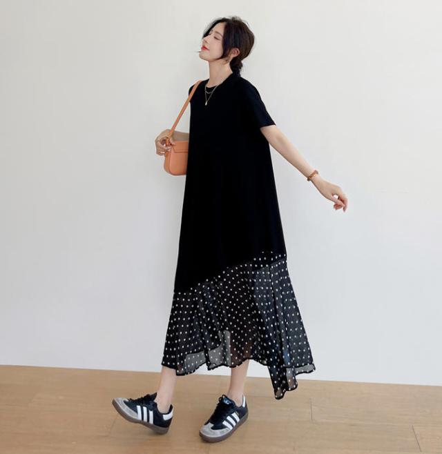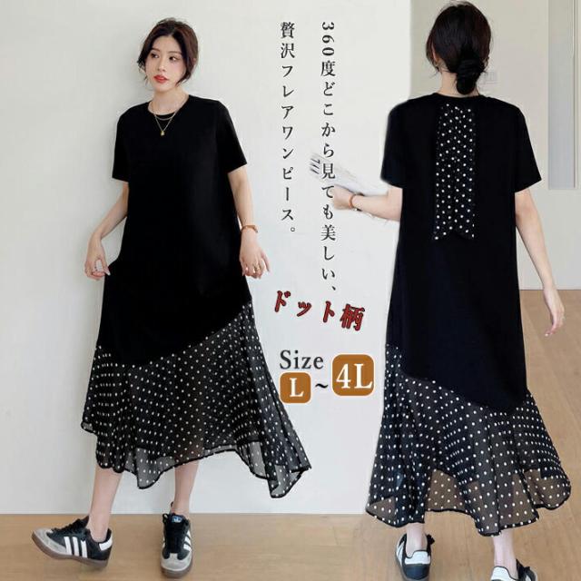 ワンピース ロングワンピース レディース 半袖 異素材切替 ドット柄 水玉 落ち感 マキシ丈 Aライン フレア フレンチスタイル ゆったり 体型カバー 大人 上品 きれいめ カジュアル 大きいサイズ L LL 3L 4L 黒 春 夏 秋