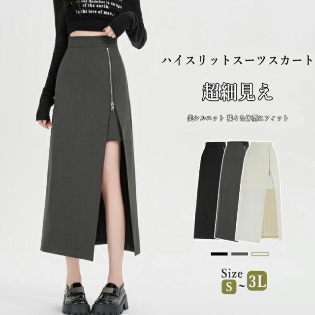 スカート ロング 春 秋 冬 ハイスリット ジップアップ フロントジップ スーツスカート タイトスカート Aライン レディース ボトムス ハイウエスト 美脚 超細見え オフィス カジュアル OL 韓国ファッション 大きいサイズ S M L LL 3L ブラック グレー ホワイト