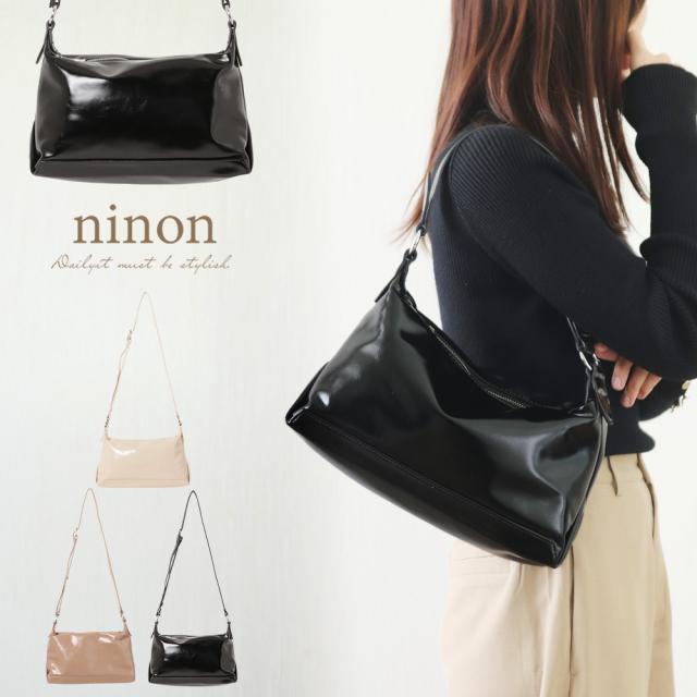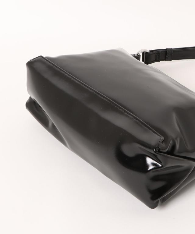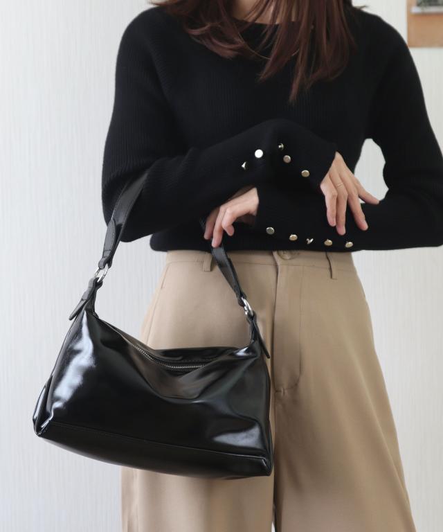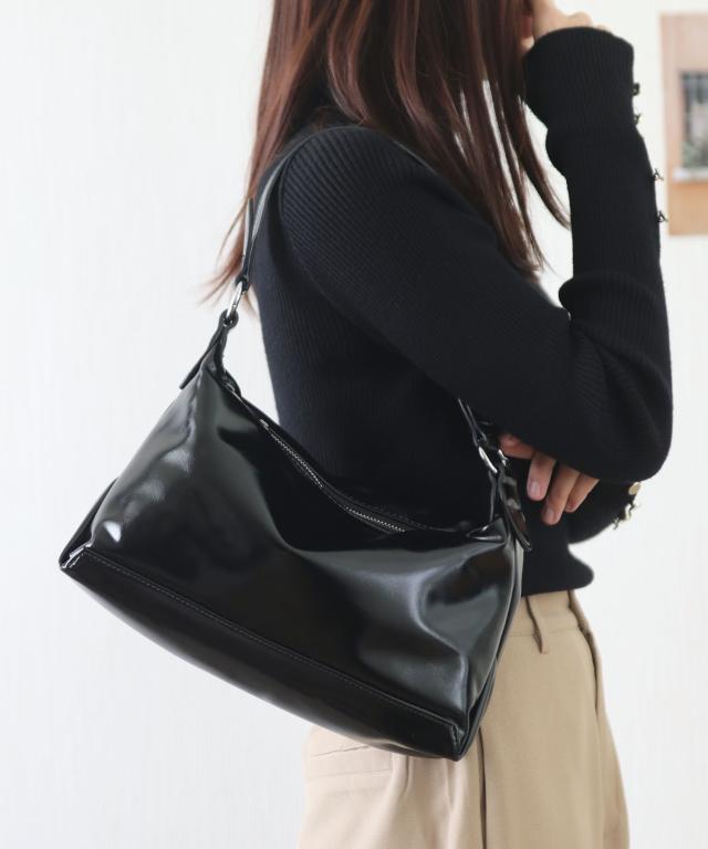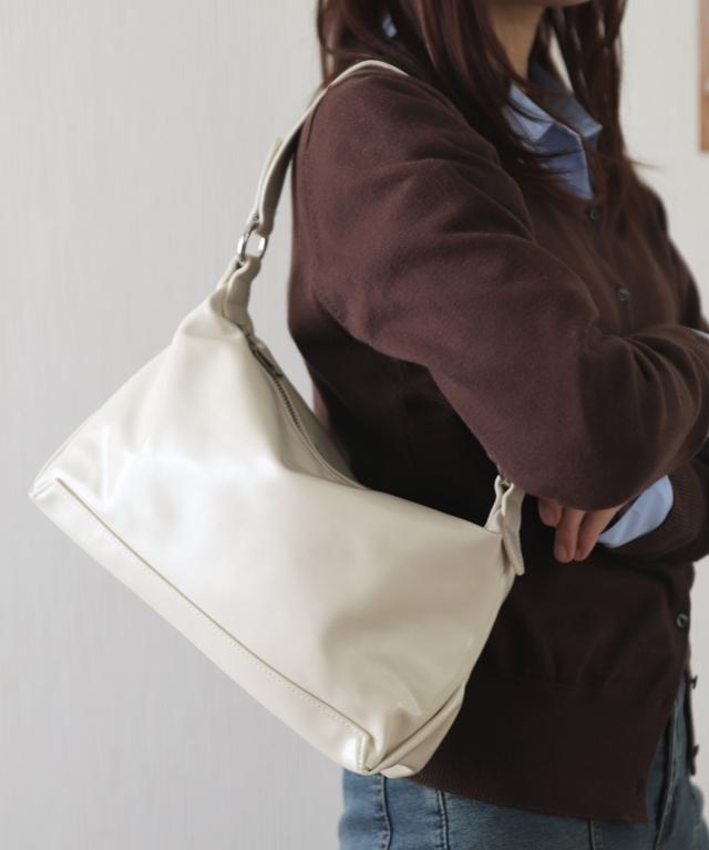 艶感のあるフェイクレザーを使用し、くったりとプレーンなフォルムが上品なハンドバッグ。