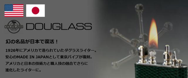 Douglas(ダグラス)。80年以上の昔、アメリカが急成長を遂げた1920年代、ひとつのライターの名品が生まれ、大量生産と大量消費の波に消えていった。その短い歴史は、1920年代の「シアーズ・ロバック」 のカタログ中での登場でうかがえる。当時の価格で5ドル、同載している他の ライターは、69セント程度で買える時代であることから、当時は驚くほど 高価で、使う人のステイタスを象徴していたといえる。