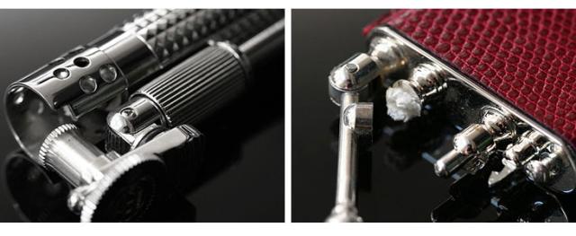 ダグラスライターの第一の魅力は、製造の全てがクラフトマンシップ により作られていること。第二の魅力は、他に類を見ない、独特な アクションを採用した着火のメカニズムです。 一見して華奢に見えるライターですが、復刻・製作に当たり 研究した結果、ひとつひとつのパーツの製造技術の高さと組立て技術の 高さとが相まって、想像以上の頑丈さと、耐久性を持っていたのです。 着火ローラーや、特に耐久性を必要とするスプリング等のパーツは、 現代のハイテックによりさらに高められるという申し分のない仕上がり になっています。